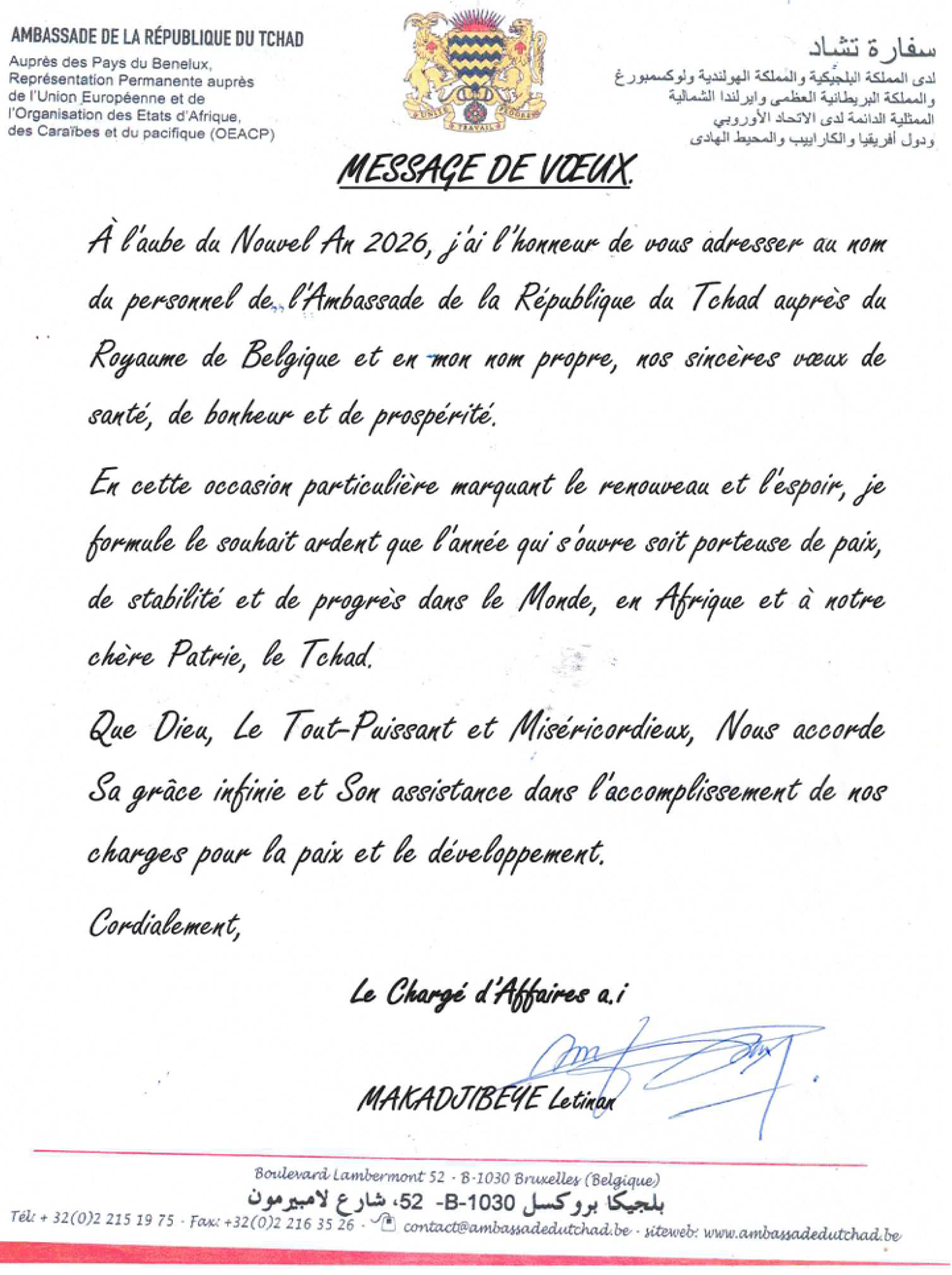 Home A la une Message de Vœux A la une Message de Vœux By Ambassade du Tchad - 30 décembre 2025 0 74 Share on Facebook Tweet on Twitter RELATED ARTICLESMORE FROM AUTHOR A la une DIPLOMATIE MULTILATERALE: La 120ème session du Conseil des ministres de l’OEACP A la une A la une La DIASPORA TCHADIENNE DU BENELUX (DTB ASBL) en de visite de travail à l’Ambassade LEAVE A REPLY Cancel reply Please enter your comment! Please enter your name here You have entered an incorrect email address! Please enter your email address here Horaires & ContactLundi à Jeudi 10h00 à 12h00 13h00 à 15h00 Vendredi 10h00 à 12h00 Boulevard Lambermont 52, 1030 Schaerbeek T : +32 2 243 76 98 Nos newslettersDécouvrez nos dernières newsletter ci-dessous : > Newsletter 01 > Newsletter 02 > Newsletter 03 > Newsletter 04 > Newsletter 05 Service VisaRenseignez-vous ici afin d'obtenir toutes les informations nécessaires par rapport à la demande de visa. Contactez-nous via le formulaire MadameMonsieur Votre nom * Votre prénom * Votre adresse mail * Objet de votre message Votre message (*) Champs obligatoires